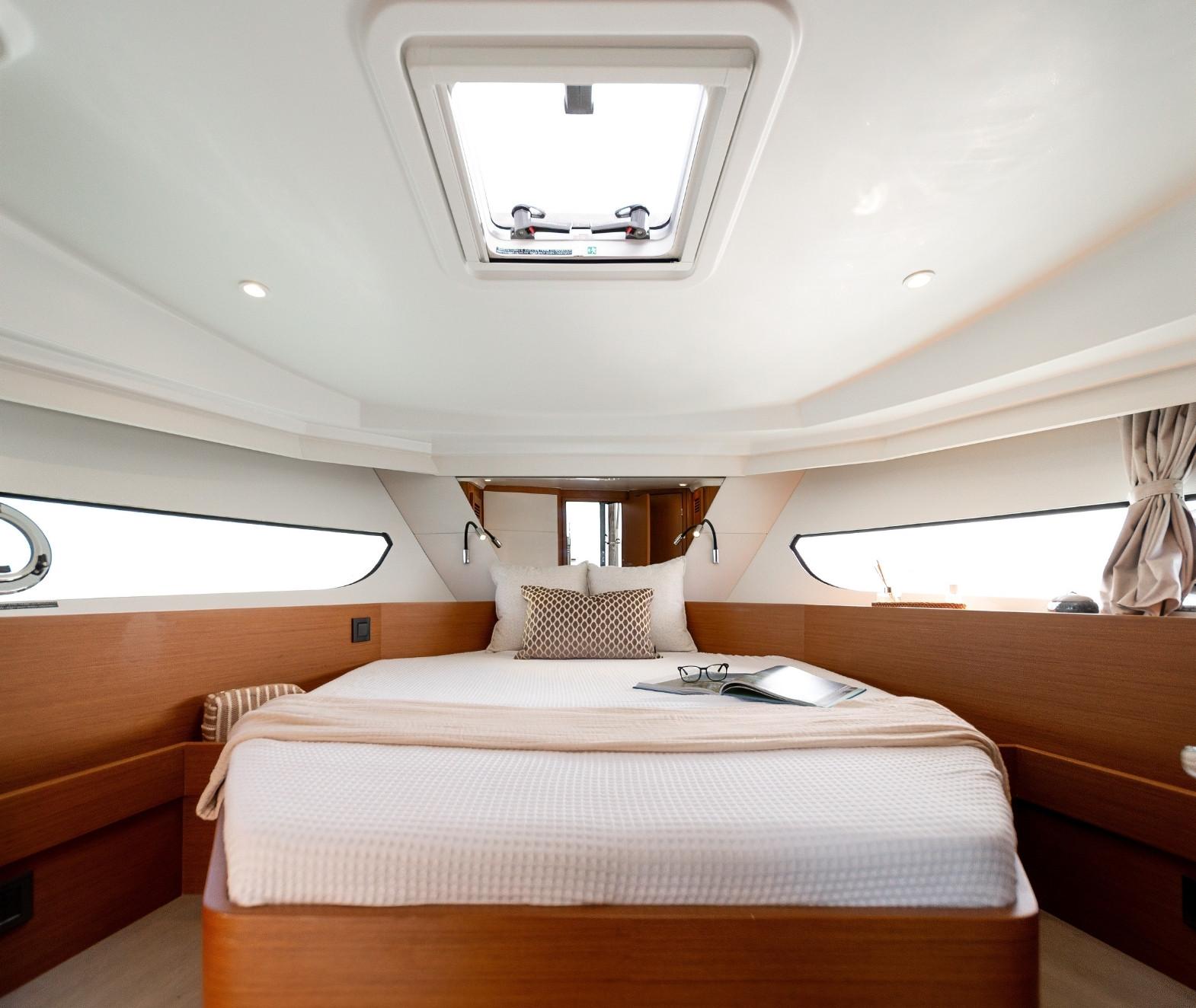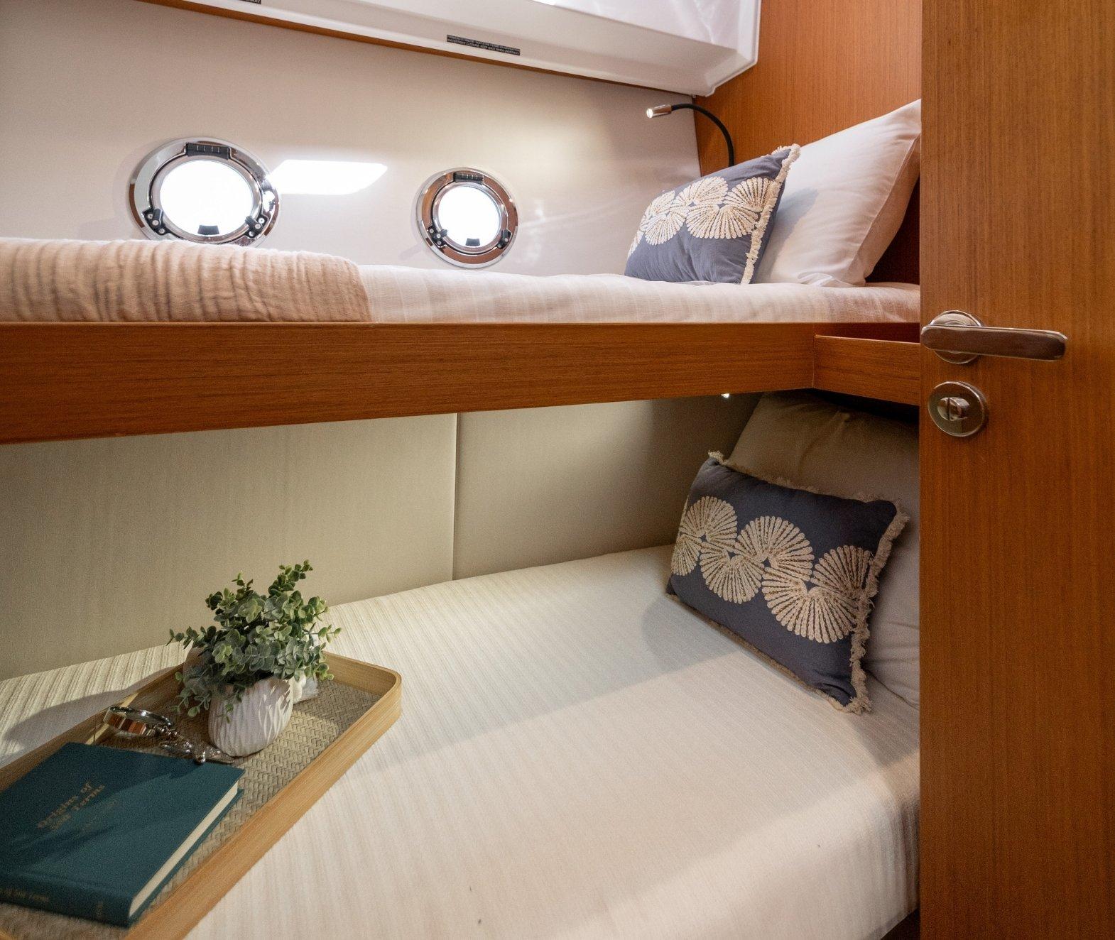 Le bateau est motorisé en Yanmar 440 CV, version 2 cabines et une salle d'eau chêne dosse.